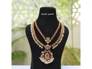 Step into royalty with a Kundan Rani Haar from Kanshi Jewels. Known for their long, layered design, these necklaces are a bridal favorite, symbolizing tradition and luxury. Perfect for grand occasions and festive celebrations, our Rani Haar designs are crafted with premium-quality kundan stones, pearls, and beads. Shop authentic, handcrafted jewellery online and experience the timeless beauty of heritage craftsmanship with safe worldwide delivery.