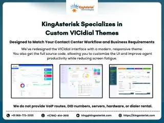 Are you running a contact center business? Still using the default VICIdial interface your team has to “adjust” to every day? As VICIdial is an open-source platform, you have full flexibility to optimize and modify the source code for your own use. Every contact center relies on tools, but not every contact center stands out. Most teams operate on plain, outdated dialer screens. Over time, agents lose engagement, supervisors spend extra time locating key data, and new hires take longer to adapt. Small design limitations quietly turn into major performance gaps. The good news? You can change that, starting with the screen your team uses every day. Our Custom VICIdial Theme Solution delivers a completely redesigned, performance-focused interface built for your environment. • Brand-aligned screen design • Smart button placement for faster actions • Clutter-free layouts • Improved navigation and workflow speed • Faster training, fewer agent errors • Modern UI that boosts engagement At KingAsterisk Technology, we redesign the entire interface: structure, layout, and usability, not just colors or logos. A smarter interface doesn’t just look better. It delivers measurable results: fewer errors, faster task completion, and improved agent focus. This is a one-time customization with full source code ownership. No monthly dependency. We are sharing a Drive link containing 10–12 different dialer themes that we have developed for various companies across different industries. These examples demonstrate our flexibility in design and our ability to align the interface with each client’s operational needs and brand identity. To proceed, please share your ViciBox version and SVN (VICIdial) version. We’ll review and share timeline and costing accordingly. Note: We do not provide VoIP routes, DID numbers, servers, or dialer rental. Call us: +91 968 773 3355 WhatsApp: +1 (786) 414 2610 Email: king@kingasterisk.com Microsoft Teams: kingasterisk sales Visit our website https://kingasterisk.com