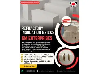 BM Enterprises is a reliable manufacturer and supplier of high-quality Hot Face insulation bricks and Insulation bricks in Faridabad for a wide range of industrial clients across the Delhi NCR region. Our insulation bricks are engineered for high-temperature applications where thermal efficiency, energy savings, and structural stability are critical. These bricks offer low thermal conductivity, high refractoriness, and excellent resistance to thermal shock, making them suitable for continuous and intermittent heating operations. Our HFK bricks and refractory insulation bricks are widely used in furnaces, kilns, boilers, ovens, reheating furnaces, and other heat-processing equipment to reduce heat loss and improve overall operational efficiency. At BM Enterprises, we ensure consistency in quality and accurate sizing to deliver dependable performance that meets diverse industrial requirements. We proudly cater to customers in Faridabad, Delhi, Gurugram, Noida, Greater Noida, Ghaziabad, Ballabhgarh, Palwal, Manesar, and other key industrial areas of Delhi NCR.