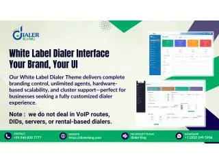 Own the Experience: Your Brand, Your UI with White Label Solutions! Is your team still using a dialer interface that looks like everyone else’s? At DialerKing, we don't just provide world-class communication tools—we give you the keys to make them your own. Why market someone else’s software when you could be marketing your own? Call us: +91 940 820 7777 E-Mail: dialer@dialerking.com Microsoft Teams: dialerking1@gmail.com WhatsApp: +1 (202) 249 5906 Explore how we can help: https://dialerking.com or https://kingasterisk.com Note: We do not provide VoIP routes, DID numbers, servers, or hardware solutions. We also do not offer rental-based dialers.