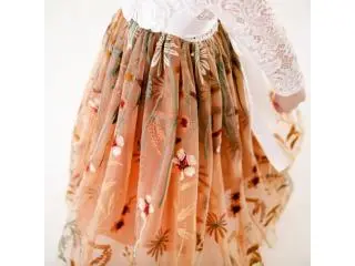 This dress is simply beautiful! It features a delicate white lace bodice paired with a burnt orange rust terracotta skirt with floral embroidery. The V-back with unfinished lace adds boho charm, while detailed lace sleeves and a removable floral sash make it perfect for weddings, birthdays, and special occasions.