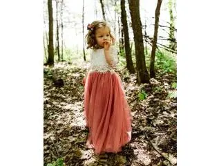This beautiful two-piece set features a delicate white lace bodice with back buttons and a flowing dusty mauve rose tulle skirt. The elastic waistband ensures comfort, while the bohemian, romantic style makes it perfect for special occasions and celebrations.