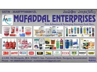 Muffadal Enterprises – Trusted Loctite Dealer & Industrial Adhesive SupplierHome - Furniture - Garden - Hyderabad (Andhra Pradesh) - October 27, 2025Muffadal Enterprises is a reliable and established Loctite Dealer, providing high-performance adhesive and sealing solutions to industries across mechanical, automotive, construction, manufacturing, marine, and engineering sectors. With years of expe...