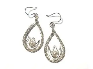 Silver wire wrap teardrop shape earrings with a lotus design in the middle with a freshwater Pearl. It’s about 2” drop length. Width is 1”. Available at : https://www.etsy.com/listing/4407192000