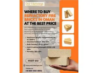 In search of the place to purchase fire bricks in Oman? Then you have come to the right place; Oniir Marketings offers quality fire bricks that resist high temperatures and are ideal for various commercial and industrial uses. The refractory fire bricks offered by us consist of high-quality materials and are capable of withstanding temperatures ranging from 1,200°C to 1,800°C. The standard size of the bricks is 230 × 114 × 65 mm, and they provide properties such as low thermal conductivity, high compressive strength, and thermal shock resistance. Fire bricks find applications in furnaces, kilns, boilers, chimneys, and fireplaces, as they help maintain heat and ensure efficient fuel use. This material is very helpful due to its heat-insulating properties, making it a necessary component in industries such as steel, cement, glass, and ceramics. They help in retaining heat, maximizing efficiency, and protecting the structure. Oniir Marketings is the most reliable fire brick supplier in Oman. Choose Oniir Marketings for premium fire bricks in Oman and insulation bricks in Oman at competitive prices with reliable supply.