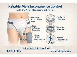 The afex management system for male incontinence offers a non-invasive, reliable solution for urine collection. Designed for comfort and secure fit, it supports active lifestyles and daily confidence. Easy to use and discreet for home or outdoor activities. Visit our website for product details and ordering information. https://www.elderstore.com/afex-incontinence-system_244.aspx