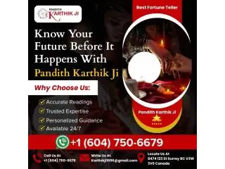 Pandith Karthik Ji is known as the best fortune teller in Vancouver, offering deep knowledge and accurate predictions to guide you toward a brighter future. Our expertise in astrology, palm reading, numerology, and spiritual healing assists individuals in finding clarity, peace, and direction in life. Whether you’re facing challenges in love, career, or finances, we provide personalized solutions and remedies designed to bring positivity and success. Connect with us today to find out what the future holds and start your journey toward happiness and fulfillment with Pandith Karthik Ji.