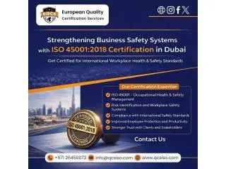 European Quality Certification Services provides ISO 45001:2018 certification in Dubai for organizations looking to strengthen workplace health and safety standards with an internationally recognized certification. We deliver reliable certification services that help businesses demonstrate compliance with occupational health and safety management systems. Our certification process supports companies in improving workplace safety and meeting global standards. We provide recognized certification that enhances business credibility and trust. Our services are suitable for industries aiming to maintain safe and responsible working environments. We make sure organizations receive authentic certifications aligned with international standards. Contact European Quality Certification Services today to obtain ISO 45001:2018 certification in Dubai for your business.
