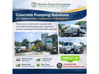 Reinvent RMC provides high quality Concrete Pumping Solutions for Construction Companies in Bangalore to increase productivity and ensure perfect concrete placement. Our pumping equipment is advanced and our operators are skilled so we can handle just about any job, no matter how big or small it is. We reduce manual labor, speed up construction timelines, and maintain consistent concrete quality for residential, commercial and infrastructure projects. Reinvent RMC specializes in meeting the needs of our clients on time with cost-effective solutions and a strong site coordination and management team. Make your construction process go faster with Reinvent RMC's concrete pumping services.